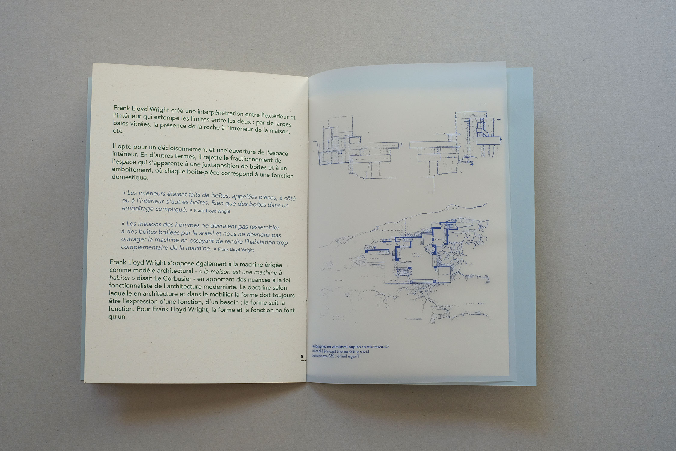 Livre imprimé en sérigraphie et numérique sur papier gris 200 g/m2, papier affiche vert 40 g/m2, papier calque 90g/m2 et papier recyclé 170g/m2, 8 pages, 21 x 15,5 cm, 250 exemplaires
