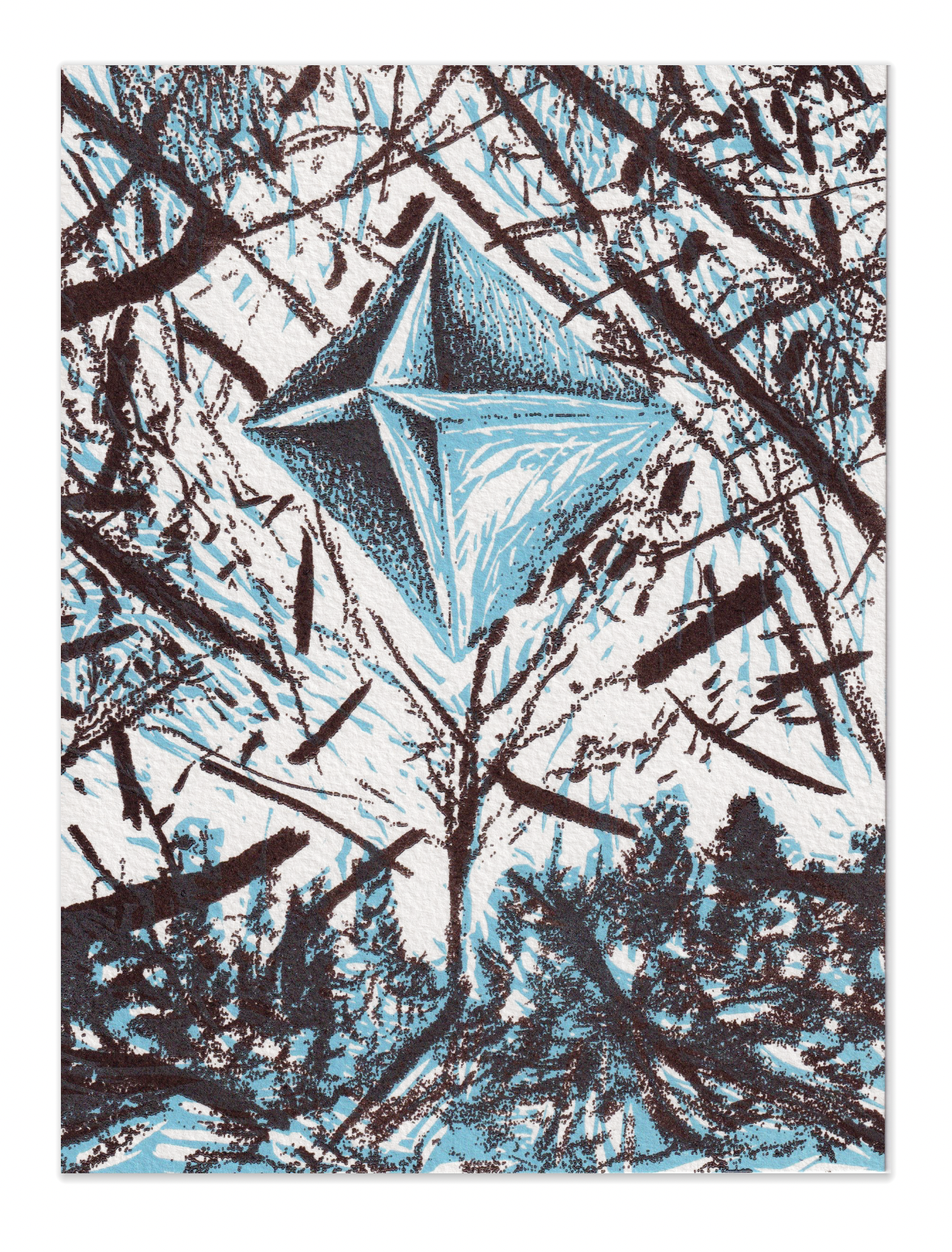 Techniques Techniques : Impression linogravure et photopolymère sur papier Velin d’Arches 250g/m2, 2 passages d’encre bleu clair et brun. Impression à la main avec l’artiste. Woodcut and photopolymer printing on Velin d’Arches paper 250g/m2, 2 layers of ink light blue and brown. Hand printing with the artist.